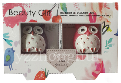 Cute owl shaped lip gloss, 2pcs packing with printed box with window. It can be as a gift set to kids and a toy to kids. Customized logo is available.